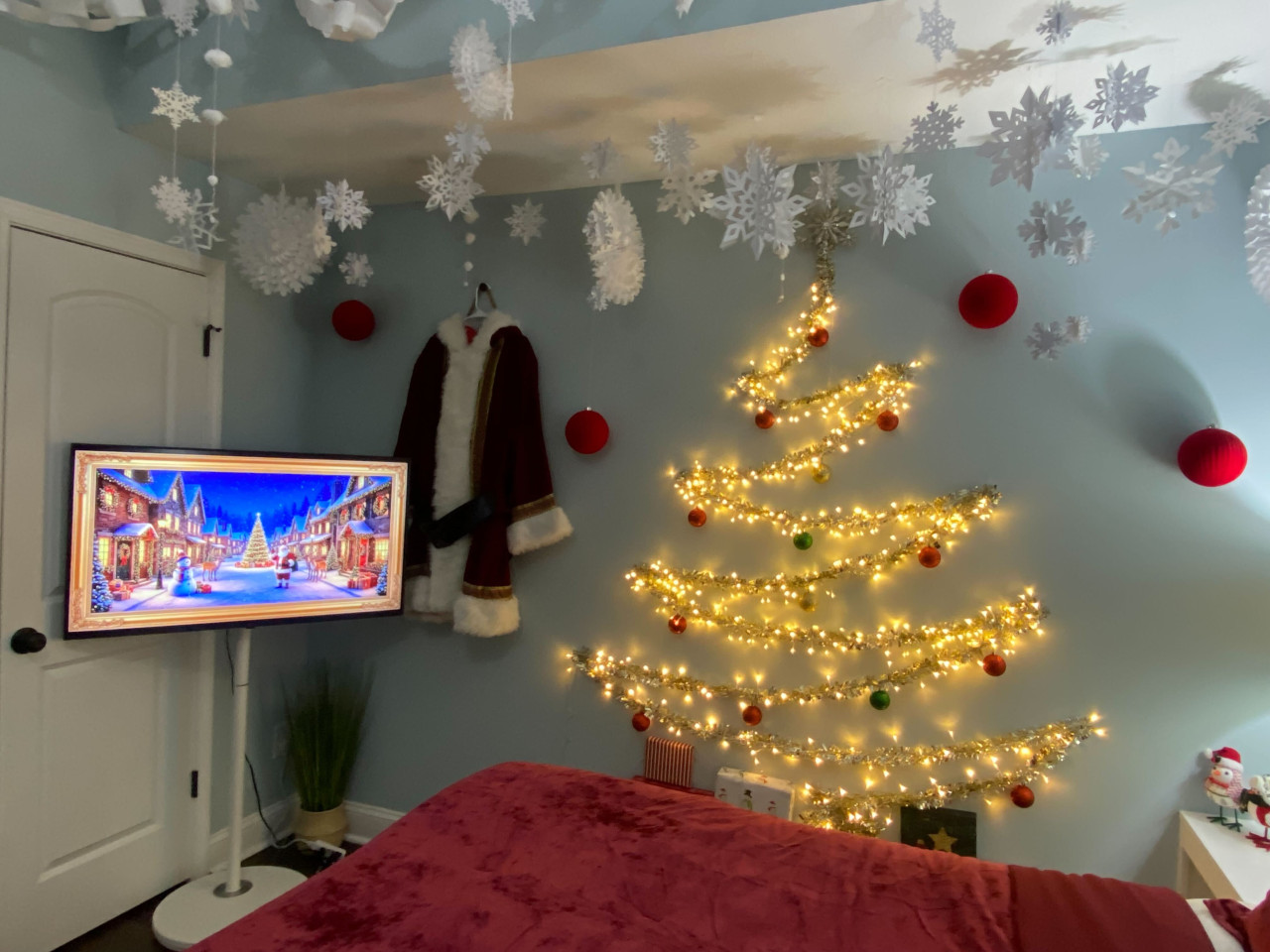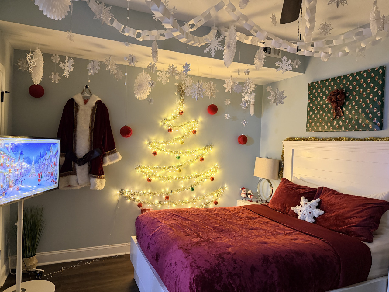Plush crushed velvet bedding A glowing lighted Christmas tree wall