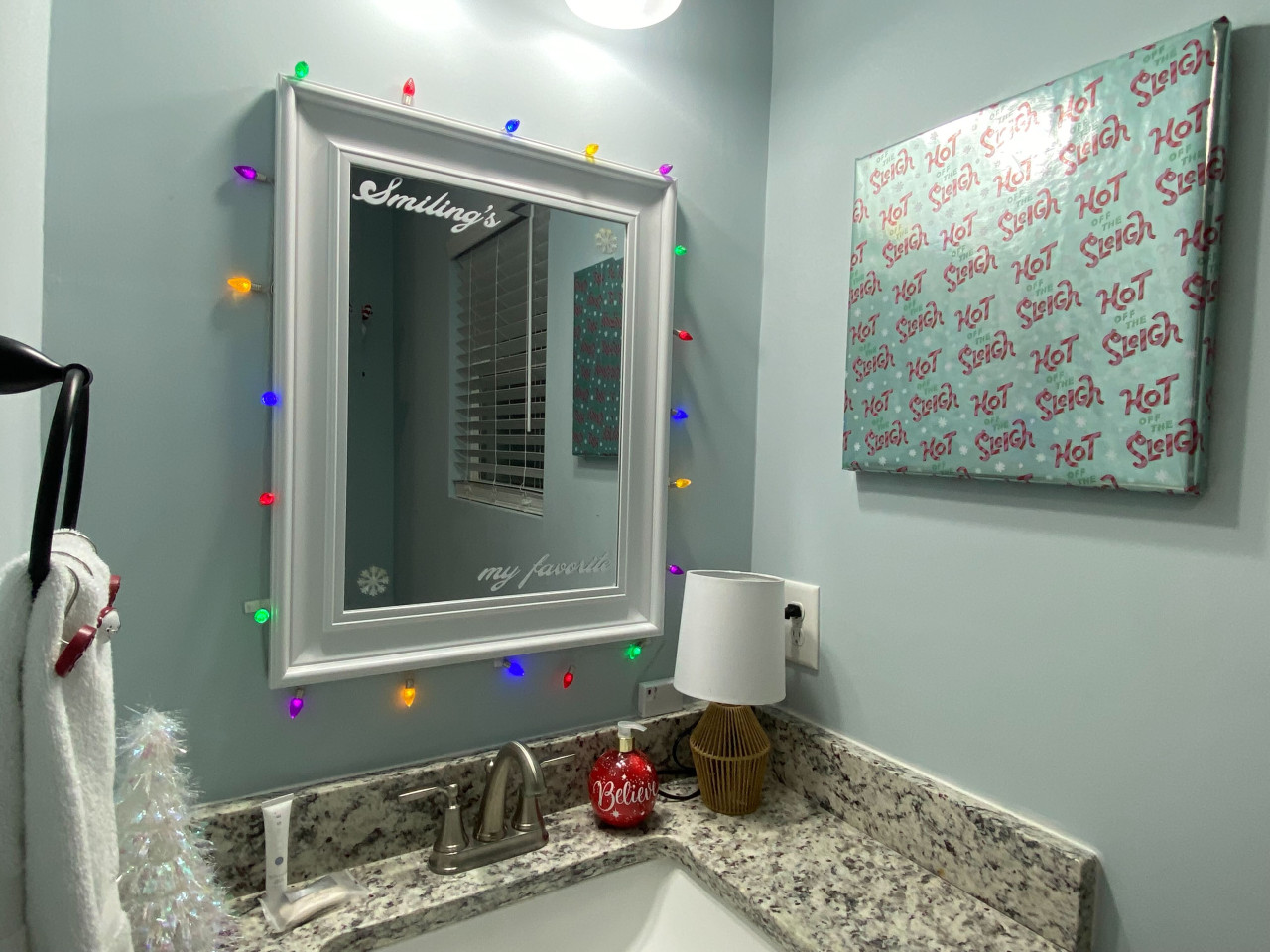 A glowing Lite-Brite “Welcome” sign inspired by the Elf movie